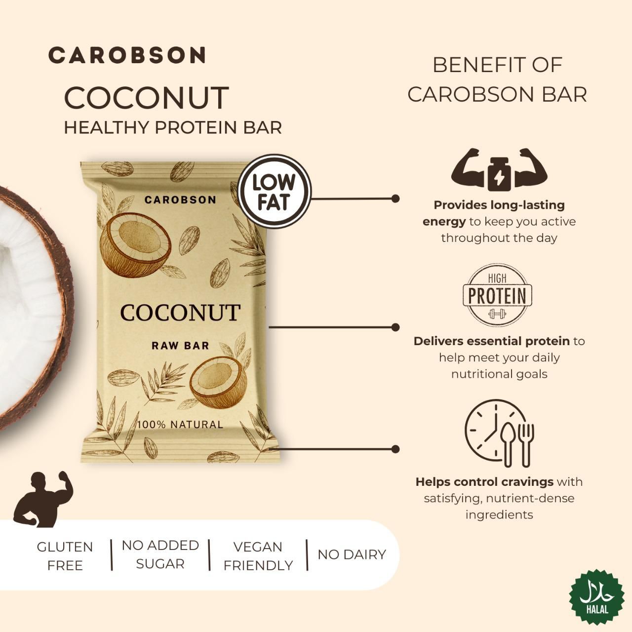 Escape to a tropical daydream with the Carobson Coconut Bar — a blissful blend of dates, almonds, hazelnuts, and coconut flakes that tastes like a hammock nap in snack form. 🏝️ It’s gluten-free, sugar-free, dairy-free, additive-free, and definitely free of boring. 💃