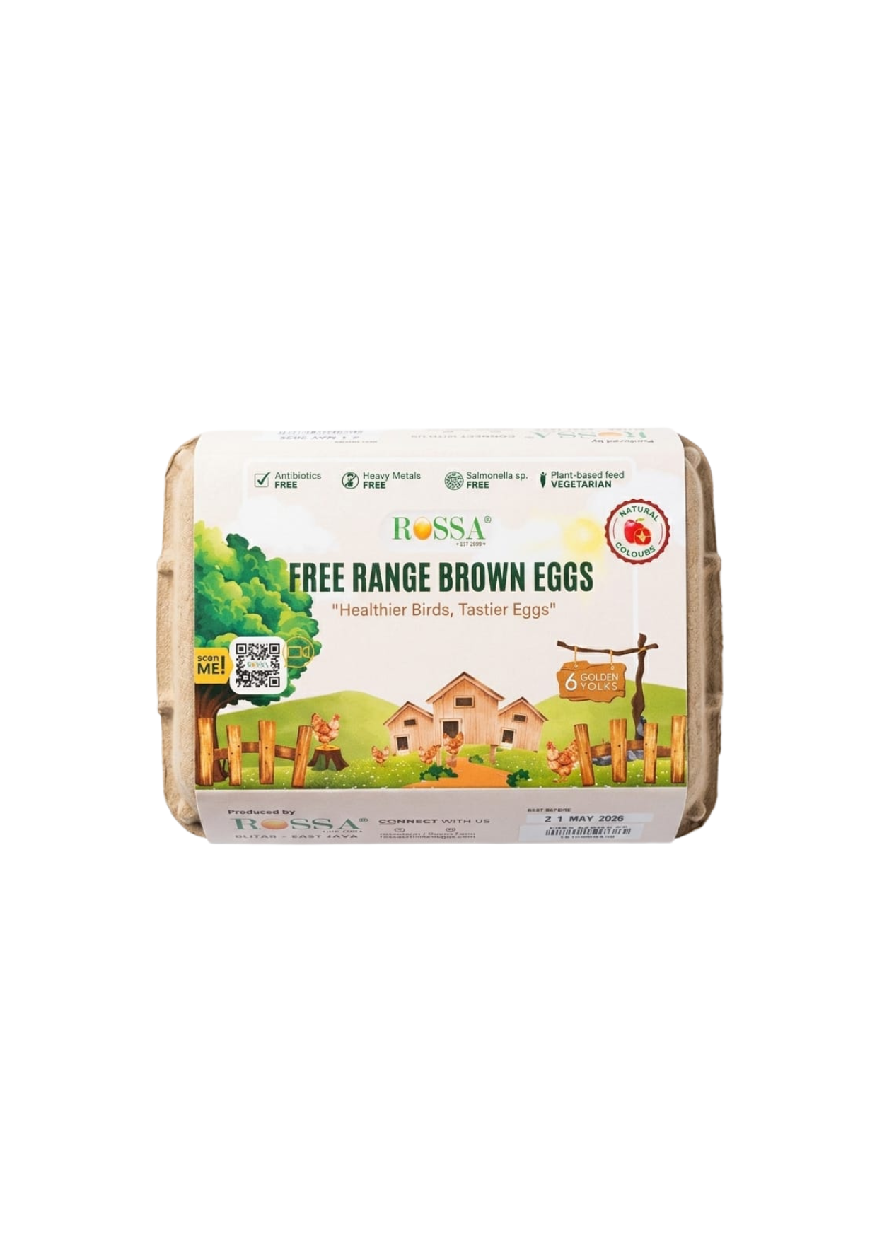Free-range brown eggs from Rossa Poultry Farm, Blitar, East Java—rich, clean, and naturally flavorful. The hens roam freely and are fed a premium natural diet (corn, rice bran, soybean meal, corn gluten, full-fat soybean, corn germ) enhanced with probiotics (Bacillus licheniformis), enzymes, and organic minerals + vitamins. Carefully handled for quality—low-allergen, hygienic, and free from harmful contaminants. Crack one open and taste the difference 🐔✨